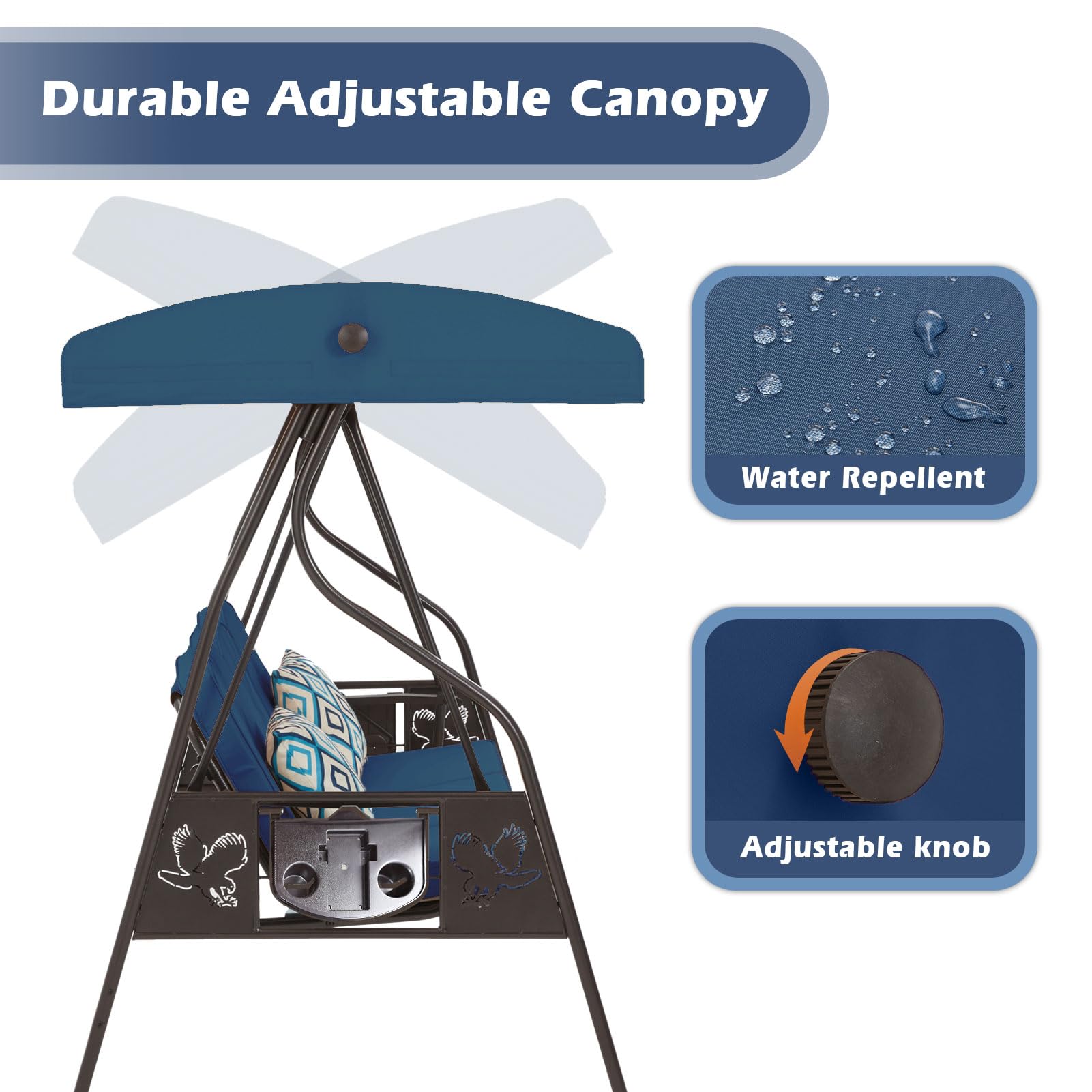 - 【Torn and unstable canopy?】-Say goodbye to these worries, the patio swing with canopy is very sturdy. The canopy is made of thicker, anti-tear, anti-fade, fluorine-free and eco-friendly fabric. Swing outdoor with reinforced adjustable knob, helps you easily adjust and securely fix the suitable angle. The canopy of covered porch swing adjusts 45°angle and protects from rain and UV rays.