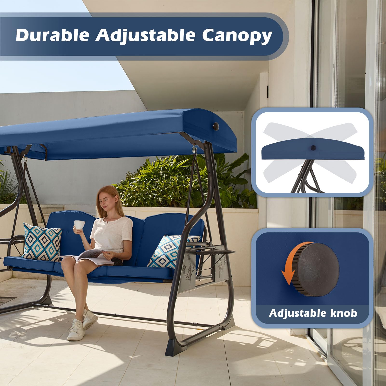 ZZW 3-Seat Patio Porch Swing 800LBS Outdoor Swing with Stand w/Canopy & Adjustable Backrest Patio Glider Chair w/Removable Pillows & Foldable Side Tray for Balcony Garden Deck (Blue)